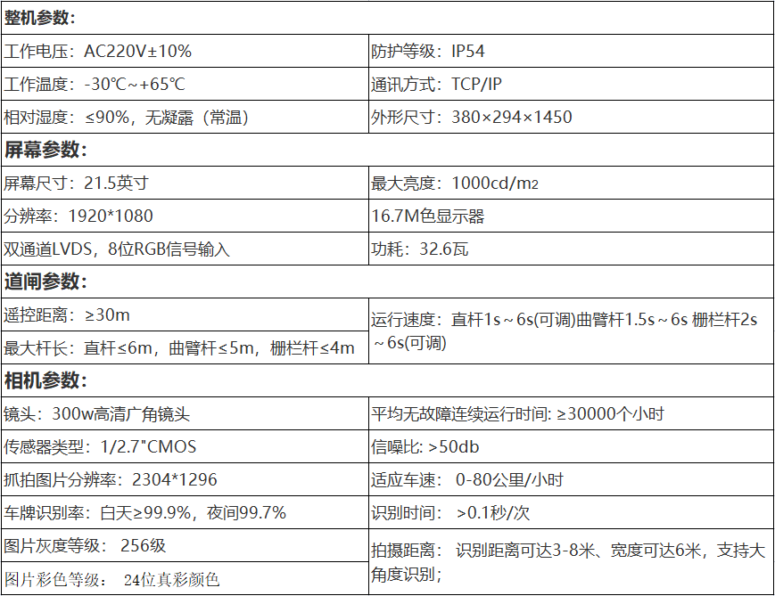 ● 集车牌识别、道闸、摄像、存储、补光、显示及语音播报为一体;